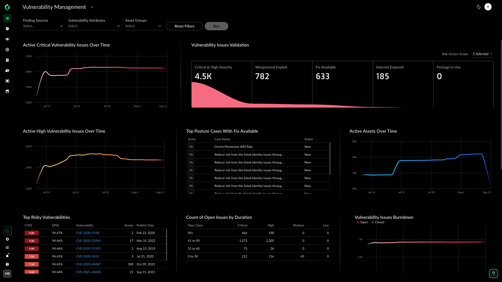 Priorisieren Sie Risiken und verringern Sie die Alarmmüdigkeit, indem Sie kritische Schwachstellen anhand von korrelierten Risikofaktoren wie externer Exposition, übermäßigen Berechtigungen, Fehlkonfigurationen, sensiblen Daten, Secrets und Malware aufzeigen.